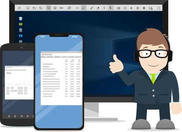 Asistencia técnica a dispositivos iOS y Android. Visualiza la pantalla de tu cliente para ofrecer una solución inmediata.